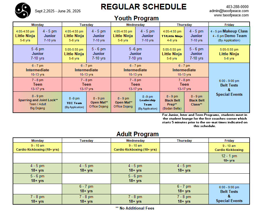 During the summer months of July and August the additional programs (after 8pm) are put on hold and the Makeup classes are taken during the week. Any regularly scheduled Friday classes are moved during the week.